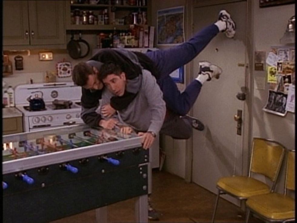 When Chandler and Monica first start secretly dating, Chandler slips up and kisses affectionately Monica goodbye before work in front of Phoebe and Rachel. Naturally, to cover it up, he has to affectionately kiss each member of the gang every time he leaves the room.
