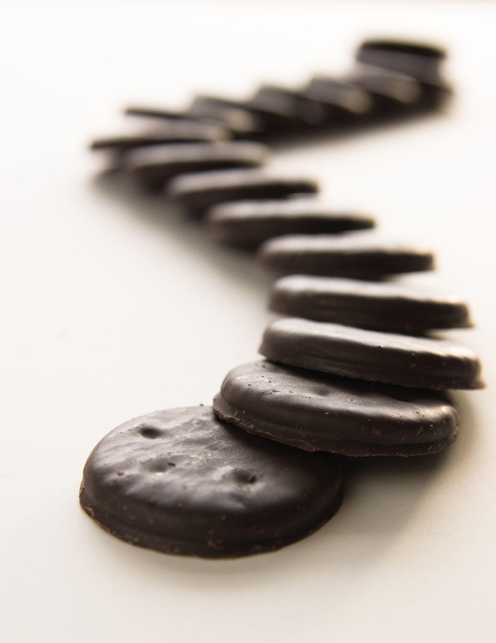 "Crisp wafers covered in a chocolaty coating. Made with natural oil of peppermint."
