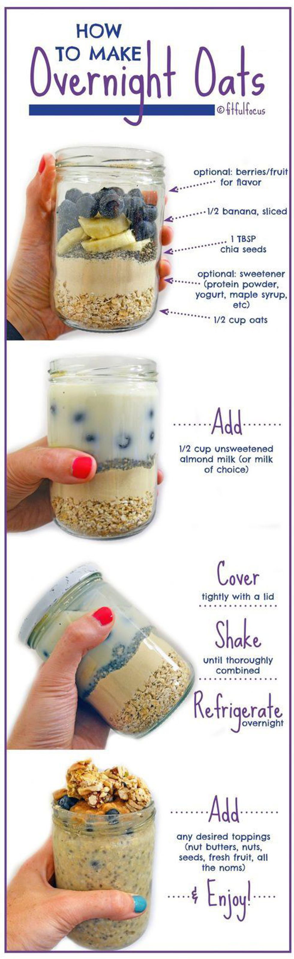 Overnight oatmeal is a great meal for rushed mornings. Chia seeds are a great source of fiber and Omega-3. Since you prepare it the night before, all you have to do is grab it and go.