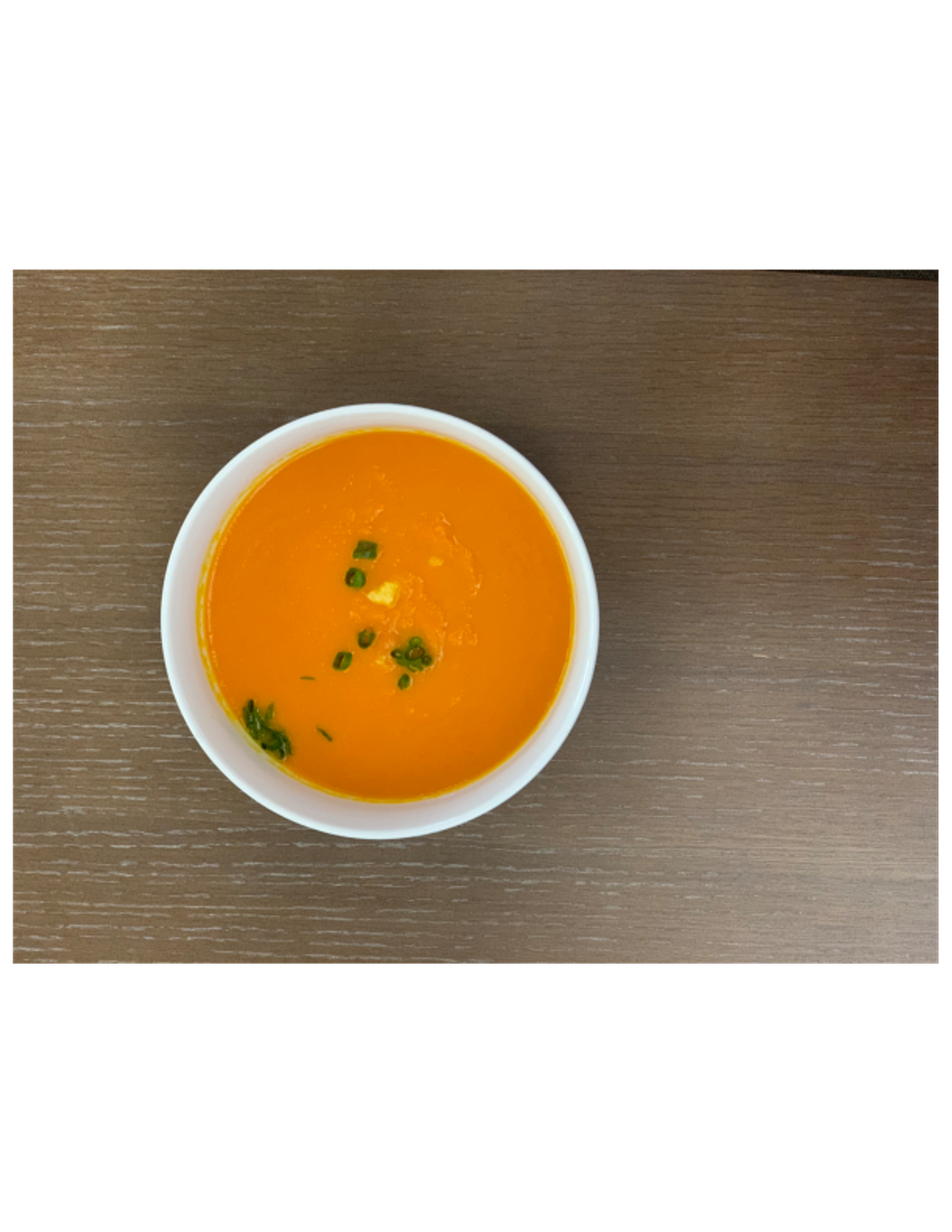 Ingredients: organic vegetable broth, carrots, ginger, honey, onion, turmeric, coconut oil, almond milk
