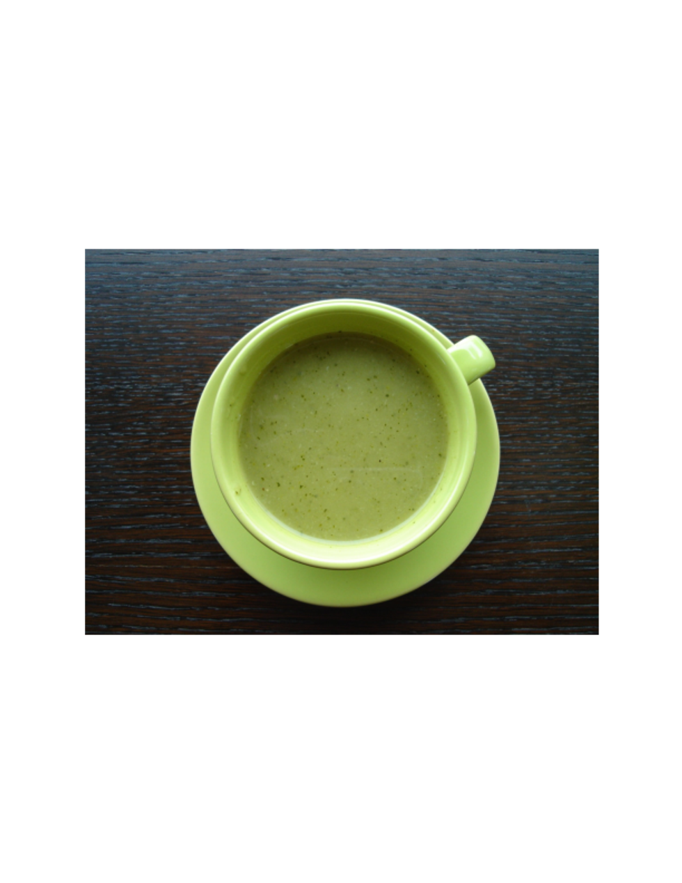 Ingredients: organic vegetable broth, zucchini, roasted yellow bell pepper, coconut oil, salt, pepper, turmeric, paprika