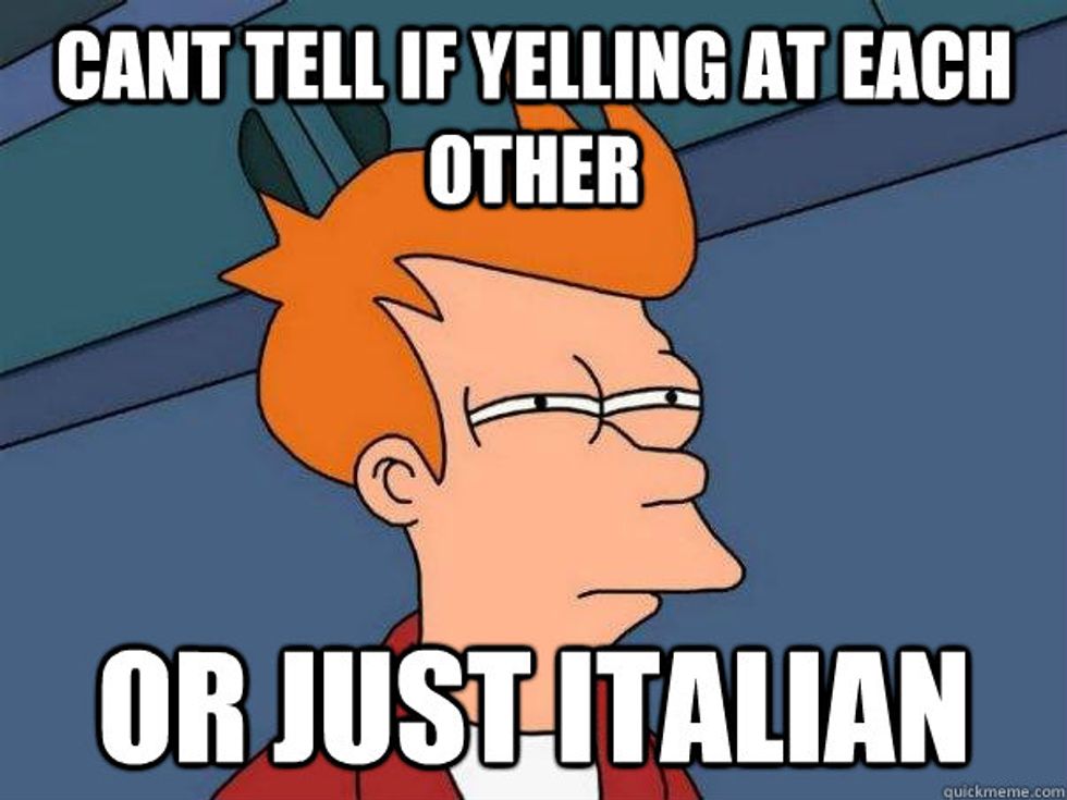 Italians are not familiar with the concept of whispering or even talking softly. Inside voices and outside voices are interchangeable. Passionate conversations or debates have a similar sound to that of a wrestling match. Even when you talk to your Italian mother on the phone, the loud Italian voice sneaks through the line and makes the entire conversation audible to everyone in the room with you.