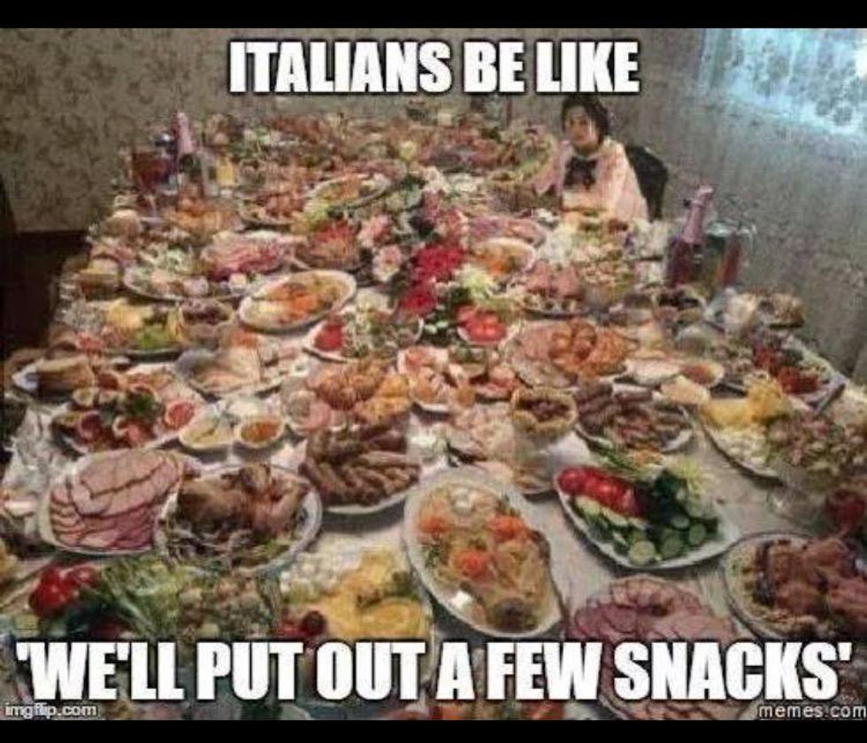 No Italian family entertains without food. Appetizers are the staple to every Italian gathering. You mom told you she was only putting out a few things, but all of a sudden the table is covered with three trays of antipasto, homemade spinach dip, cheese and crackers, rice balls, a Naan bread pizza, deviled eggs, and crab cakes. By the time everyone has finished the appetizers, no one is even hungry for dinner anymore.