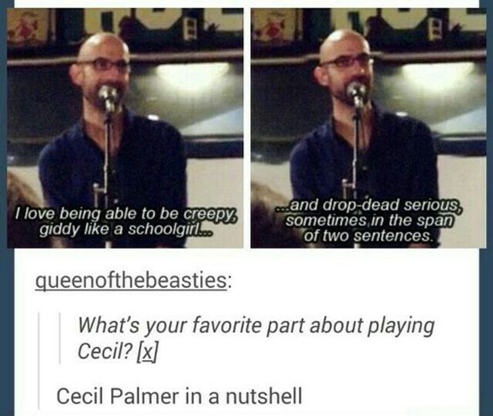 Cecil, the narrator of "Night Vale," has been known to get extremely excited over things like Khoshekh, the cat who hovers about 4 feet off the ground in the men's bathroom at Night Vale Community Radio, or Carlos, his scientist boyfriend. And even though he's on air, he's never ashamed of his interests or excitement.