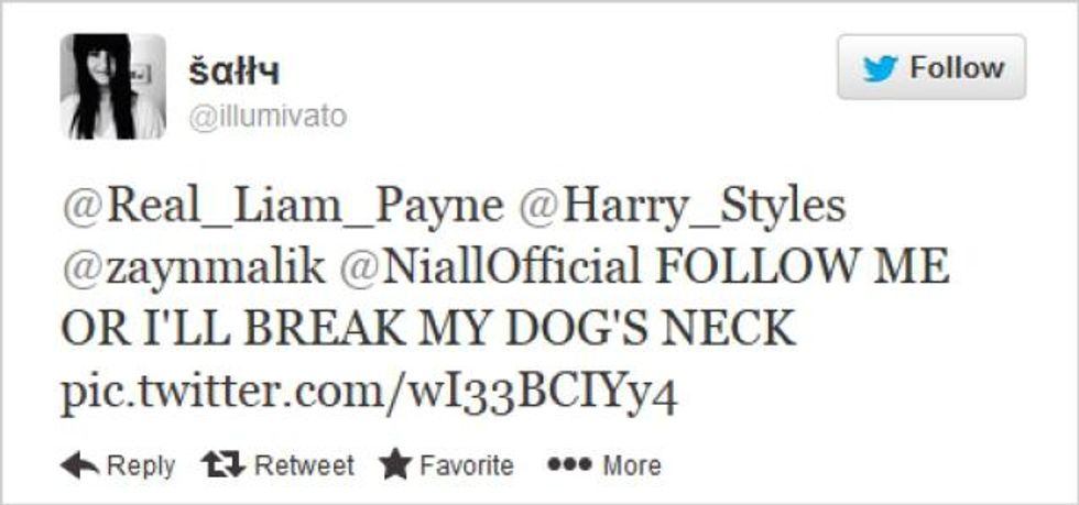 There are different kinds of crazy but this kind really takes the cake. Among the millions of “Directioners” that follow the boy band, One Direction, there was one particular fan that went absolutely psycho after receiving no response from the band members on Twitter. The Twitter user @illumivato threatened Liam Payne to follow her back on the social media website or she would kill her dog. Attached to the tweet was a picture of the Chihuahua being held down by its neck by the fan. After no response from the pop star, the fan tweeted another photo to him with the dead dog in her arms and the statement, “I love you. Follow me. My dog has just died.” The same fan had tweeted violent posts to other members of the band in the past with pictures of small animals in blenders and even with her mother in a choke hold. What a psycho! (Obviously due to the graphic nature of some photographs found online, Twitter screenshots have been posted instead)