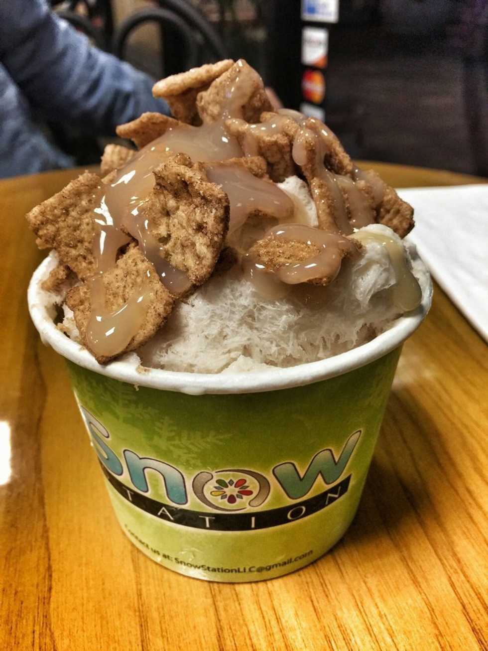 It might sound a little weird, but this Asian dessert is to die for! The texture is really unique-- its like a very soft, flaky, snow texture. You can get toppings on it ,and there's a bunch of flavors to choose from. If you're ever tired of ice cream and wanted to venture out into a new type of dessert, try Snow Station!