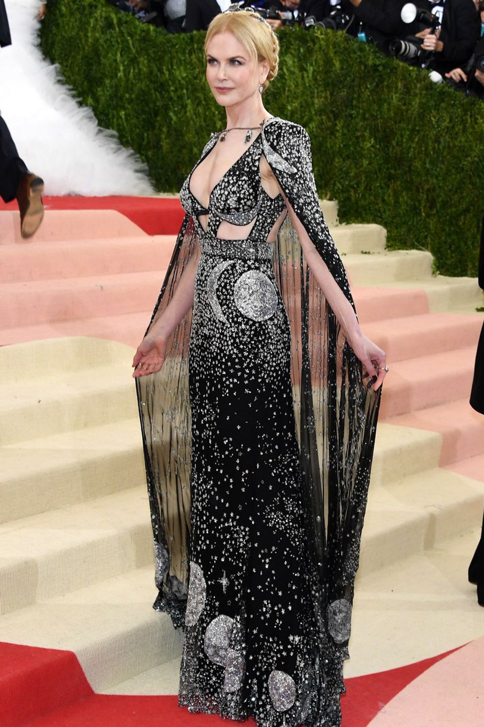 Kidman's caped gown came from Alexander McQueen, and the diamond tiara on her head came from Fred Leighton. The entire dress is studded in diamonds to form various stars and moons, and it makes Kidman look like a complete goddess, which she already is.