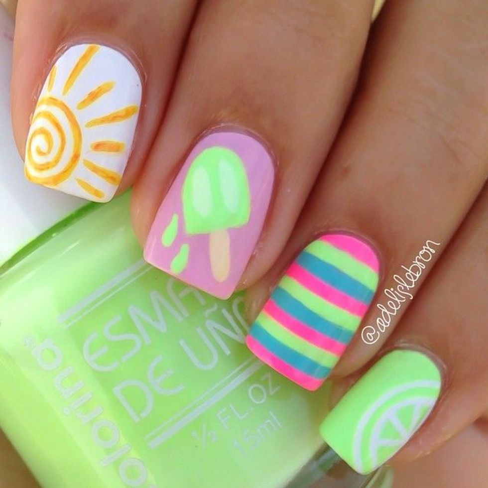 What better way to sport your new tan than to showcase a sun on your nails? If the lime green in this design is a little too funky for you, you can always go with a muted tone, like DND’s “Creamy Macaroon.”5. Watermelons