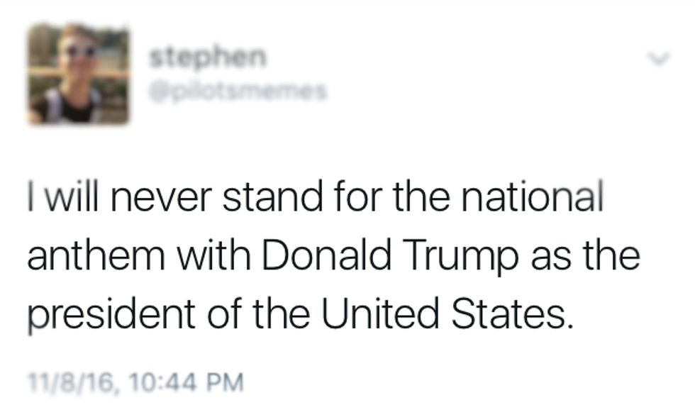 Not standing for the National Anthem has become a huge form of protest, starting with the Black Lives Matter movement and now this. This is absolutely ignorant on so many levels. For one, it has nothing to do with your president or whether or not you think you're being oppressed. Francis Scott Key wrote "The Star-Spangled Banner", originally titled "The Defense of Fort McHenry", after he watched the fort be bombarded by the British during the War of 1812. Key was on a ship, and when he woke the next morning and looked through the porthole upon Fort McHenry there was smoke everywhere and you could smell the destruction but the flag was still flying. This song was about unity. It's about how soldiers stood together and risked their lives so that we could be where we are today. The flag was still flying, tattered and torn, but strong.