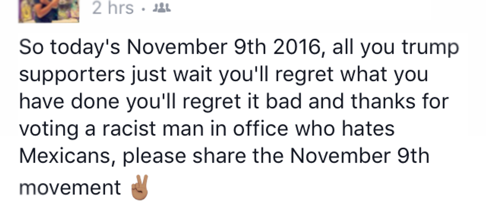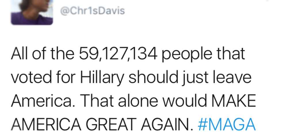 Many of the rude things that I want to talk about are directed towards Hillary Supporters who are mad, however I find this tweet particularly annoying because to me it is so important for us to come together. Unity is what makes a great country, a great country, You can't fight a war divided. Win or lose, agree or disagree it is vital that we stand together, as one.No matter who we voted for, we are now under the same president, in the same country and we need to recognize that and move on to "Make America Great Again."