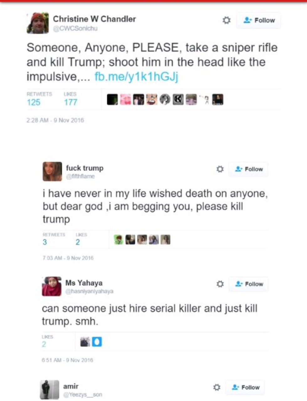 Now, there are many things I could end this with. There are plenty of other posts that showed how awful the people of this country have become, but I thought that this was just the best thing. Here are grown adults making death threats at not just the next president, but at someone's husband, someone's father. I feel like if nothing else shows how the people of America have lost their minds, their conscience, their humanity, then this will. I hope that all of these comments are taken seriously and that each and every one of the people who threaten the president's life will be charged with a terrorist act and thrown in jail. These heartless, empty shells, of people deserve nothing less.