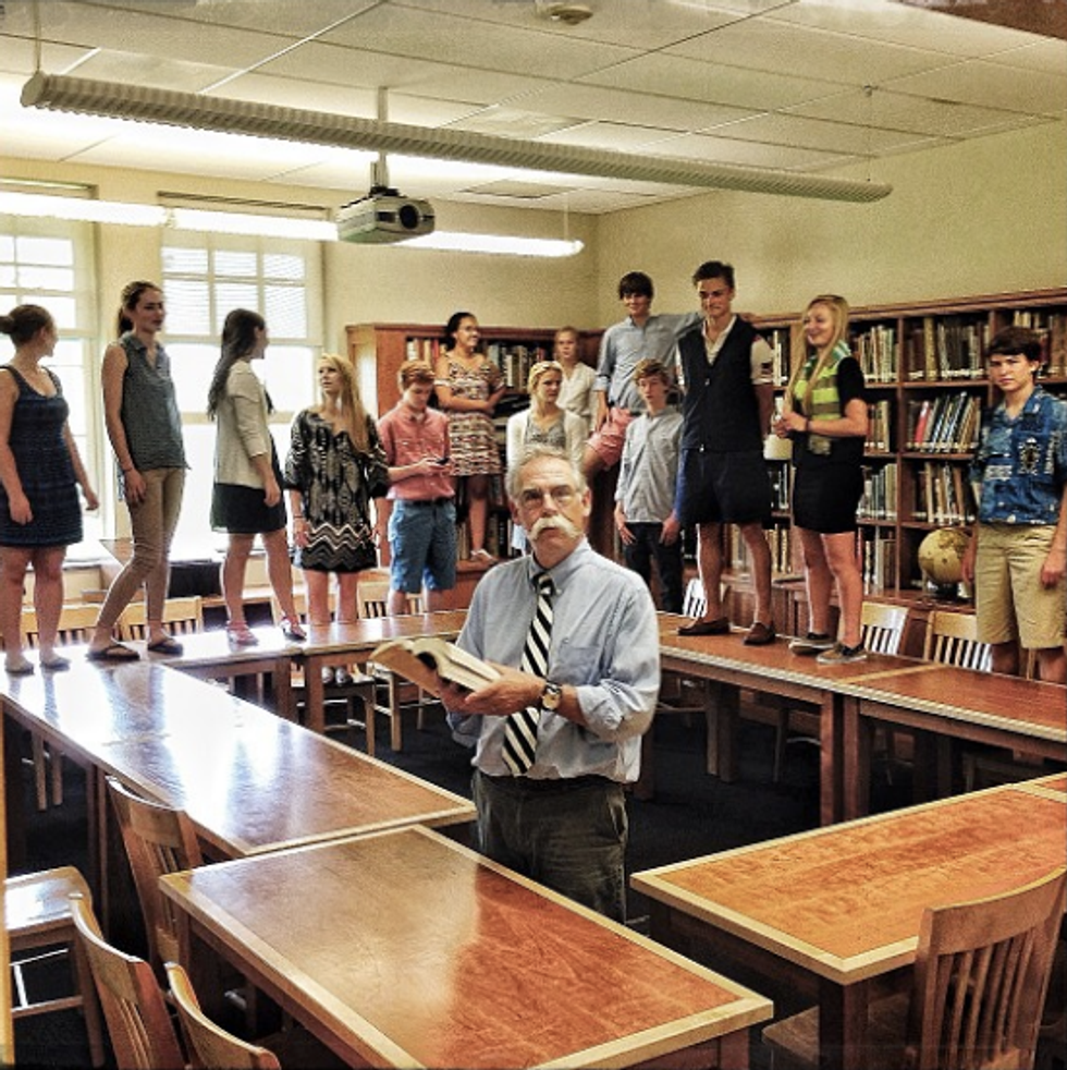 If it's not outside the classroom, there is still unique learning in the classroom. For example, we learn poetry by standing on chairs, which sounds weird but that's sophomore-me in the background with the tribal print dress and I still remember this day.