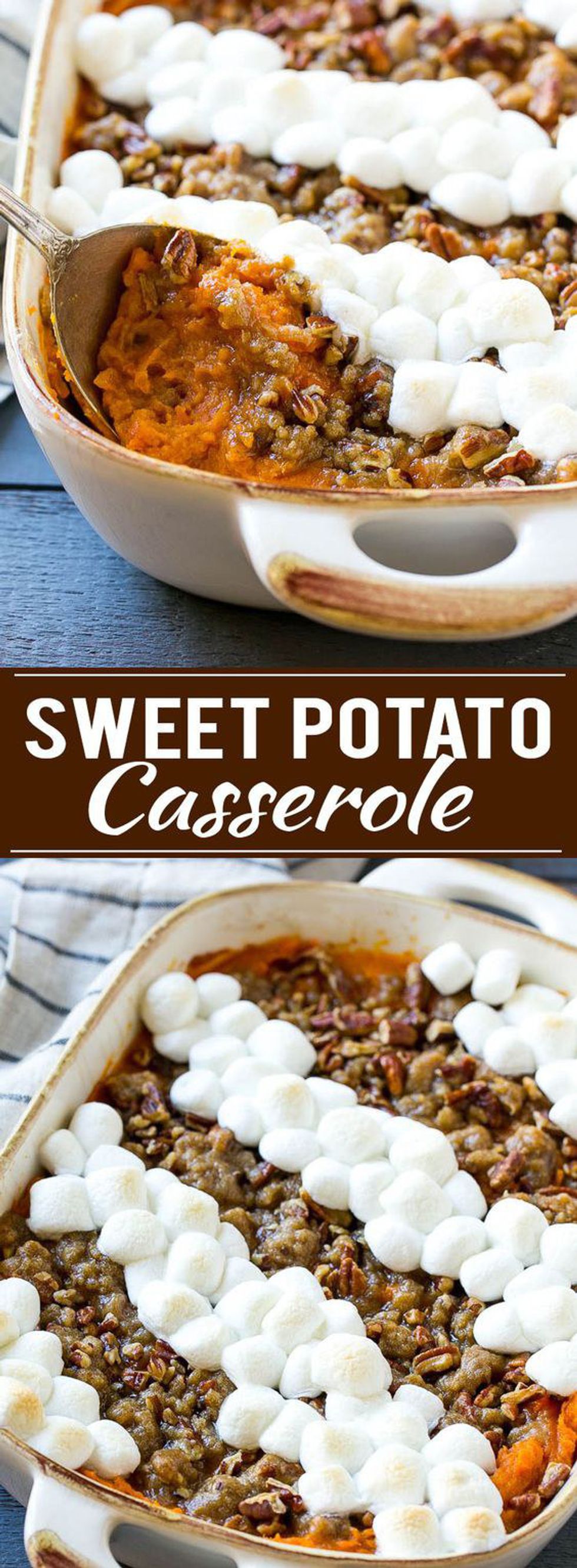 This recipe contains mashed spiced sweet potatoes, topped with both a pecan streusel topping and plenty of mini marshmallows.