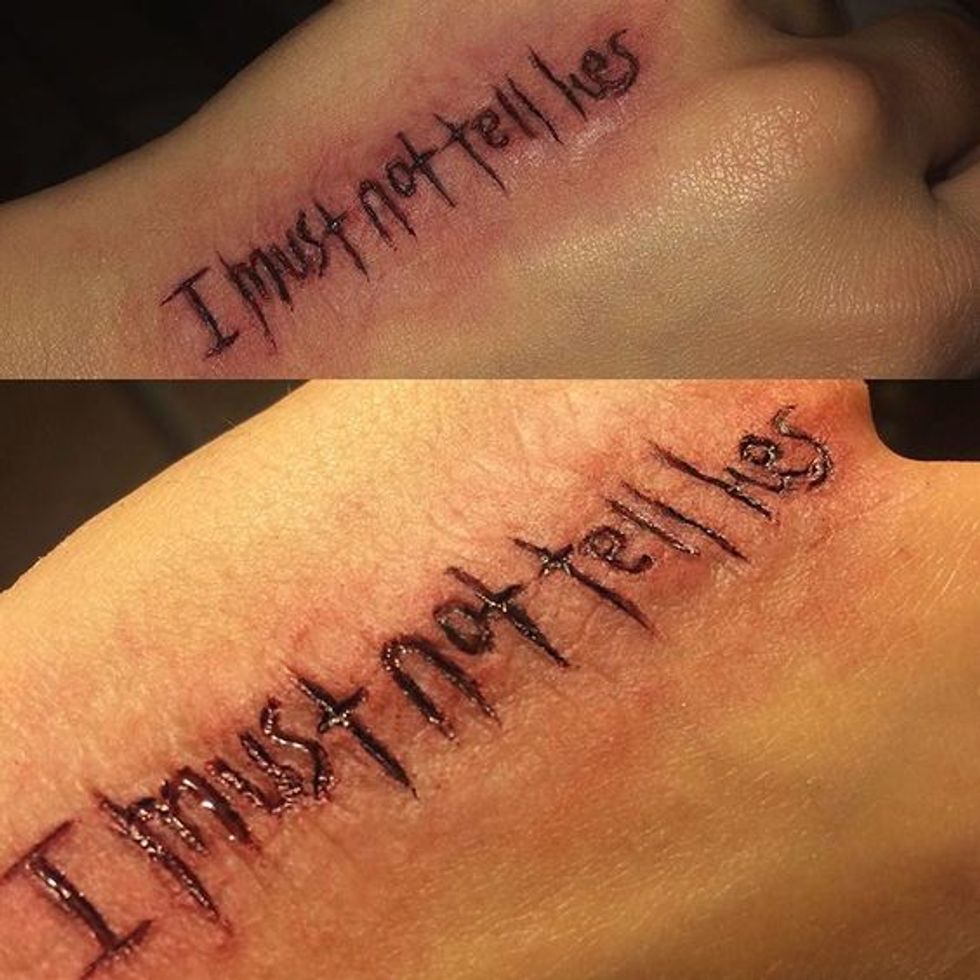 Scar wax is going to be your BFF for anything requiring cuts or gashes on the skin. Just smooth out some scar wax onto the top of your hand and add some texture to it using a sponge to give it that "skin" look. Carefully carve the words into to scar wax using a needle or safety pin and then add fake blood accordingly. To make the skin look like it is irritated, you can really use any red substance, blush being the easiest. Ben Nye also has some great creme makeup wheels that you can use.
