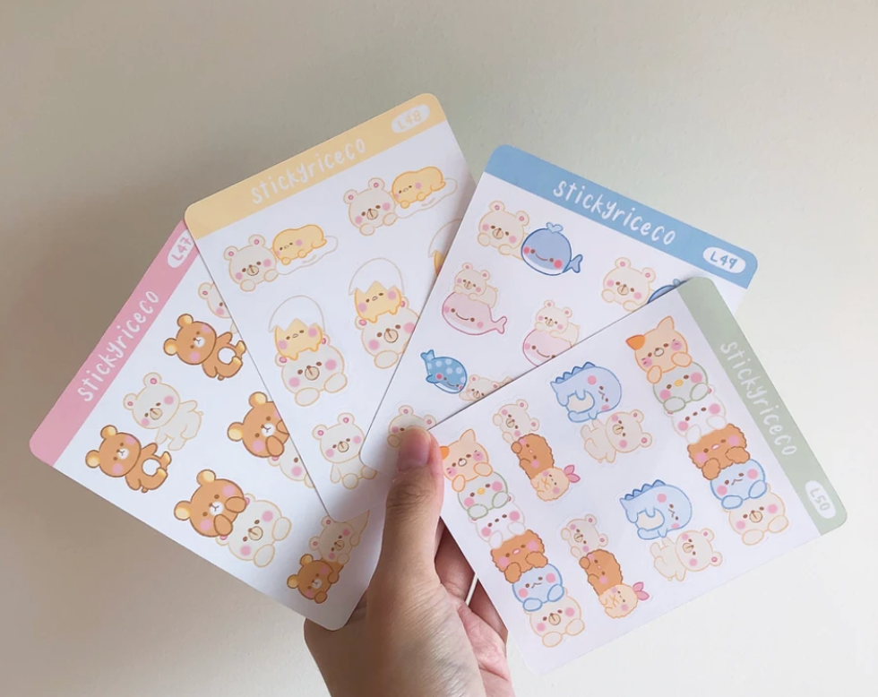 I love @stickyriceco because they have a variety of sticker sheets to choose from. I love how they combine their original character, Rice the Bear, with other characters from San-X and Sanrio in their own style! They also sell grab bags that include a variety of memo sheets and stickers! This is a great option if you want to have a variety of stationery without buying an entire memo pad or sticker set. Lastly, they also sell washi tape, pins, and cute keychains!