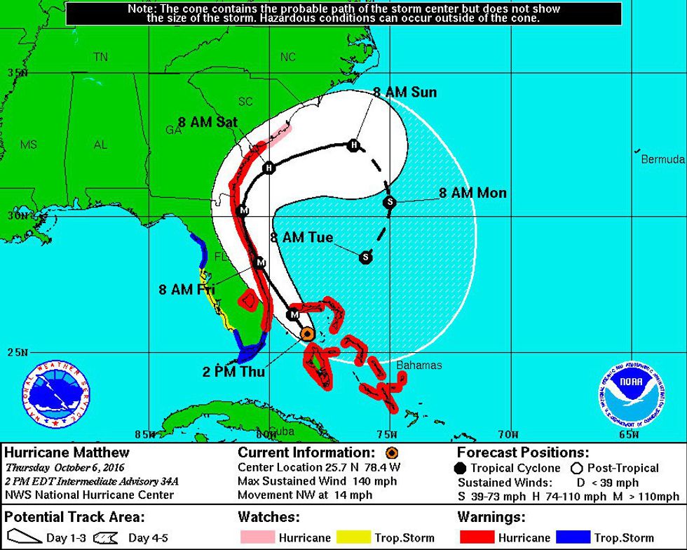 Later that afternoon, I was scrolling through Facebook avoiding the copious amounts of work I had to do and saw a post saying classes for Thursday and Friday were cancelled. At first, I was surprised because not only what my friend had told me came true, but in fact, Hurricane Matthew was projected to hit southern Florida's coastline and continue its way up to the Carolinas.