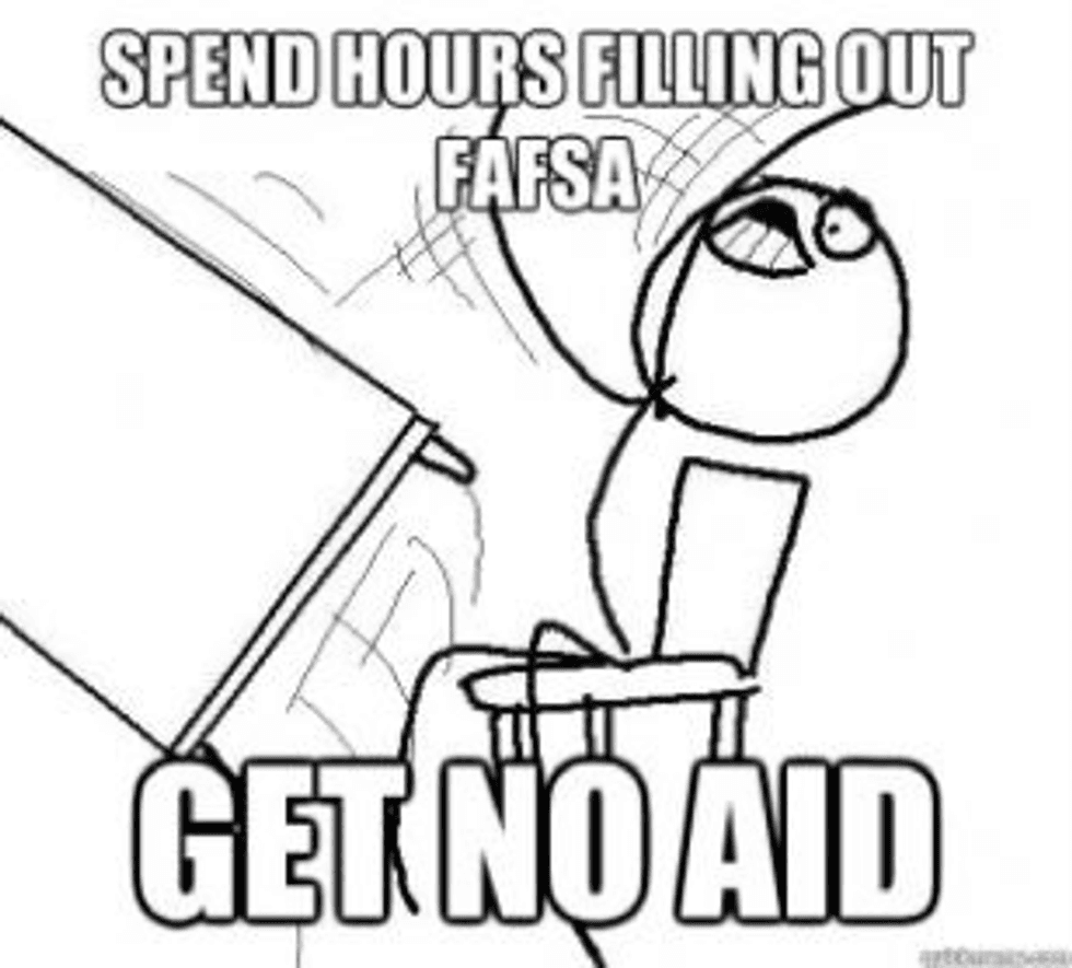 On Jan. 1, 2015, I stood in front of my computer ready to do my FAFSA. I stared at the screen blankly hoping it would give further instructions. I was stuck and confused. After a mini tantrum and asking others for help I finally got it and finished my FAFSA. I was thrilled! Months passed and I waited for my aid letter. The day finally came and I couldn't wait to cry tears of joy while I read the aid I would receive. Instead I cried tears of sadness when it was zero dollars. I couldn't believe I'd wasted five hours for nothing.