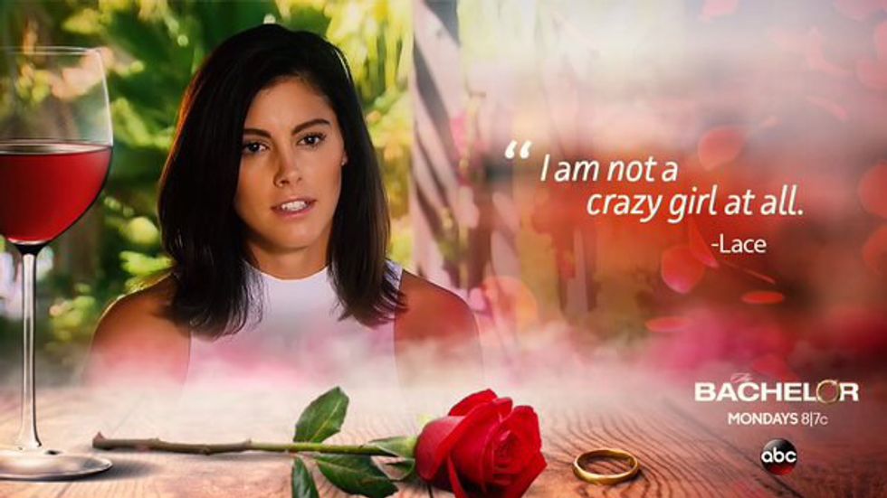 Is this a joke? Lace? I knew the moment she introduced herself, said five words and went in for the first kiss she would be psychotic. Boy, was I correct. Instead of signing up to be on "The Bachelor," she should’ve signed up for some therapy because now the entire world knows she is a lunatic