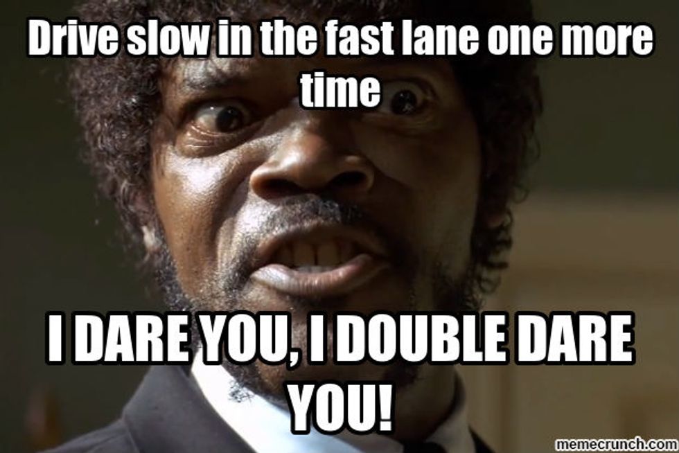 I hate this. Do not get in the fast lane if you are not willing to go ten miles over the speed limit. Oh, and if you speed up just so I can't pass you... that's just an a-hole move.