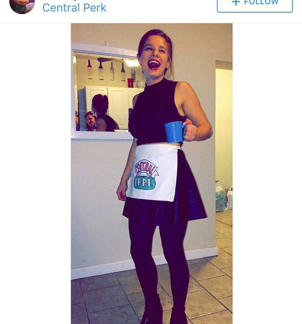 I recently saw this on Instagram a few days ago. I thought this was very creative, something I've never seen before. And it's very simple, even I could do it! All you have to do is get an apron, a white crop top, a black skirt and black flat-top wedges. Then, just print out a picture of the "Central Perk" sign and paste it onto your apron. And boom- you are a hip 90s waitress from Friends.