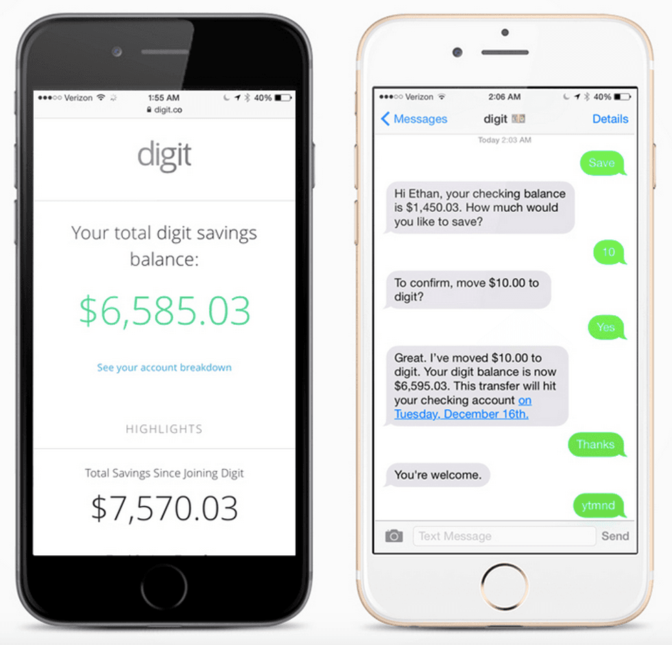 Digit is a company insured by the FDIC that connects to your checking account. It calculates your income and spending, and then saves an appropriate amount of money away in a third party account. You can withdraw, choose to save more and view your Digit account either on their website or through text.