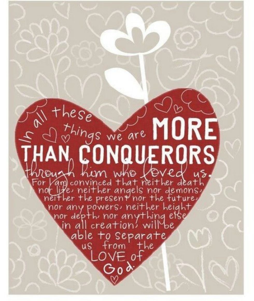 3. “No, in all these things we are more than conquerors through him who loved us. For I am sure that neither death nor life, nor angels nor rulers, nor things present nor things to come, nor powers, nor height nor depth, nor anything else in all creation, will be able to separate us from the love of God in Christ Jesus our Lord.” (Romans 8:37-39)