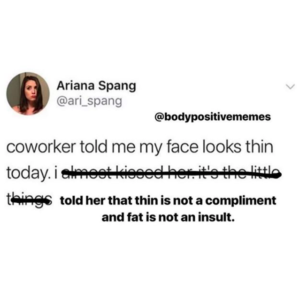 This particular account takes memes, text posts and other visual materials and, well, fixes them. It's truly eye-opening to see real twitter posts like the one above, which upon reading you may laugh, and agree with it and move on with your day, because we are so used to being shamed for our bodies and the way we look. It's also a really easy way to teach body positivity to someone who may not fully understand, and to check and dismantle our own fatphobia.
