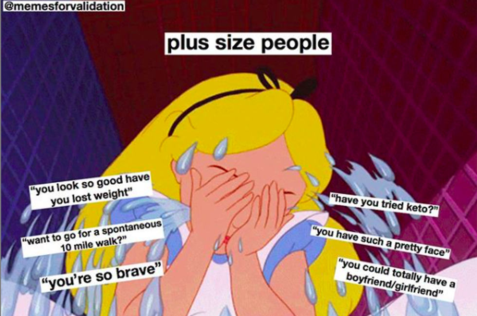 I can relate to some of these memes, and some of them I can't. As someone who definitely benefits from thin privilege in some ways, but is still on the smallest end of plus size, I believe it's so, so important to educate myself (without asking for extra intellectual labor from marginalized fat people) so that I can be of service to those fighting fatphobia in their daily lives. Understanding and checking our own fatphobia (internalized or not) and educating others is one of the best things we can do for fat people!
