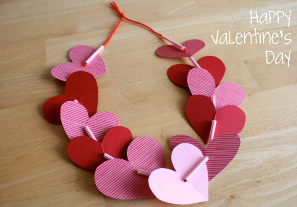 For this gem you will need-yarn cut at any length you prefer. Cut up plastic straws and construction paper hearts. (Don't be lazy either, cut up your own hearts!)