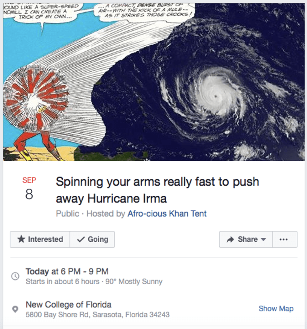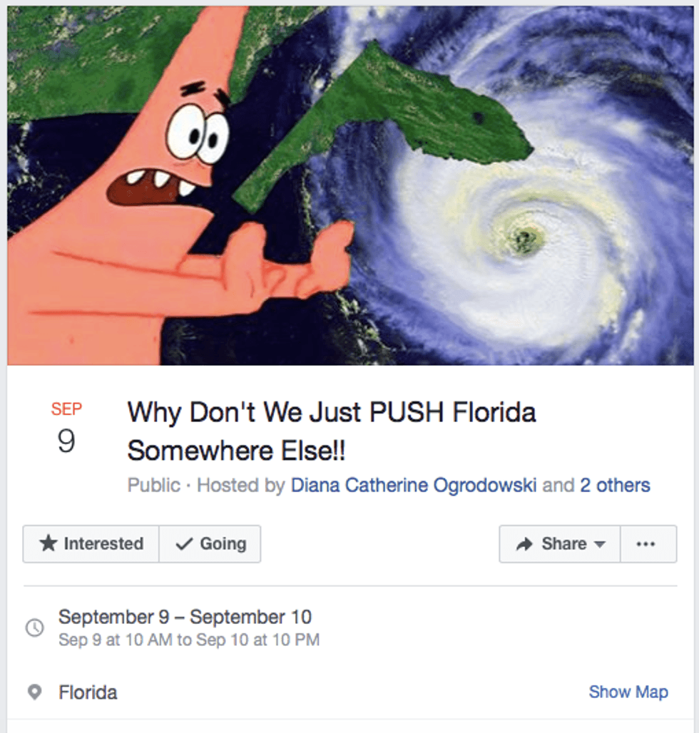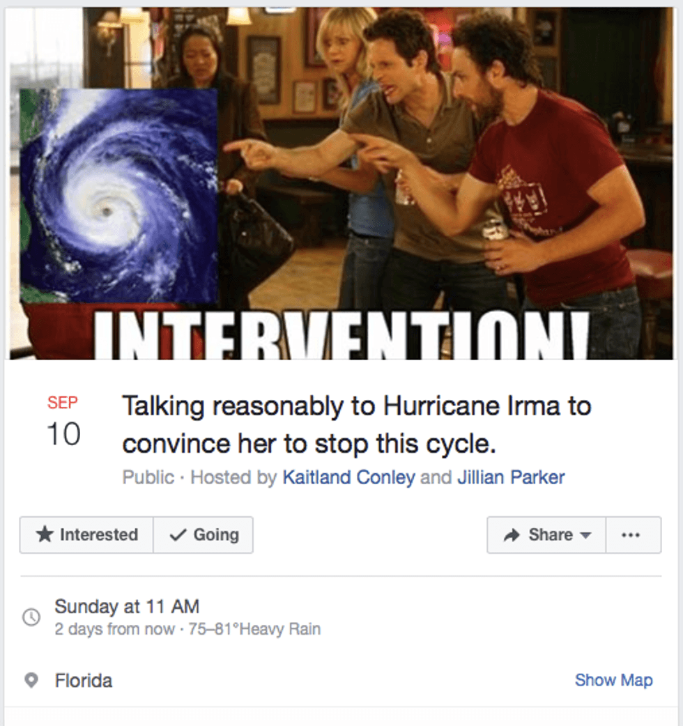 We all know that a hurricane is no joke. Between insane rain and winds faster than the sports car guy dangerously weaving through traffic on the interstate, it is important to take them seriously. However, after you pick up some cases of bottled water, canned food and make other necessary preparations, there is no harm in having a little comedic relief. So, here are just a few of the weirdly specific and hilarious Facebook events people have made in order to have some comedic relief while preparing for Hurricane Irma.