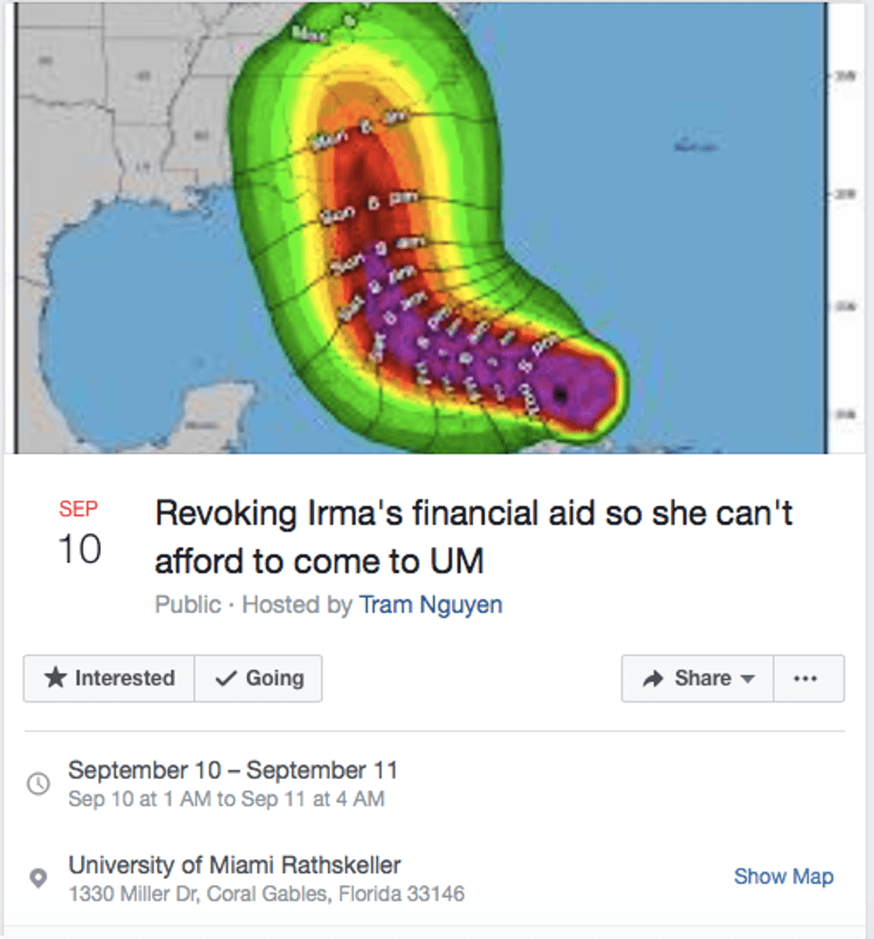 Irma is exhibiting terrible behavior and therefore the FAFSA needs to reject her financial aid at the University of Miami. Doing this will definitely force her to move away from Florida.