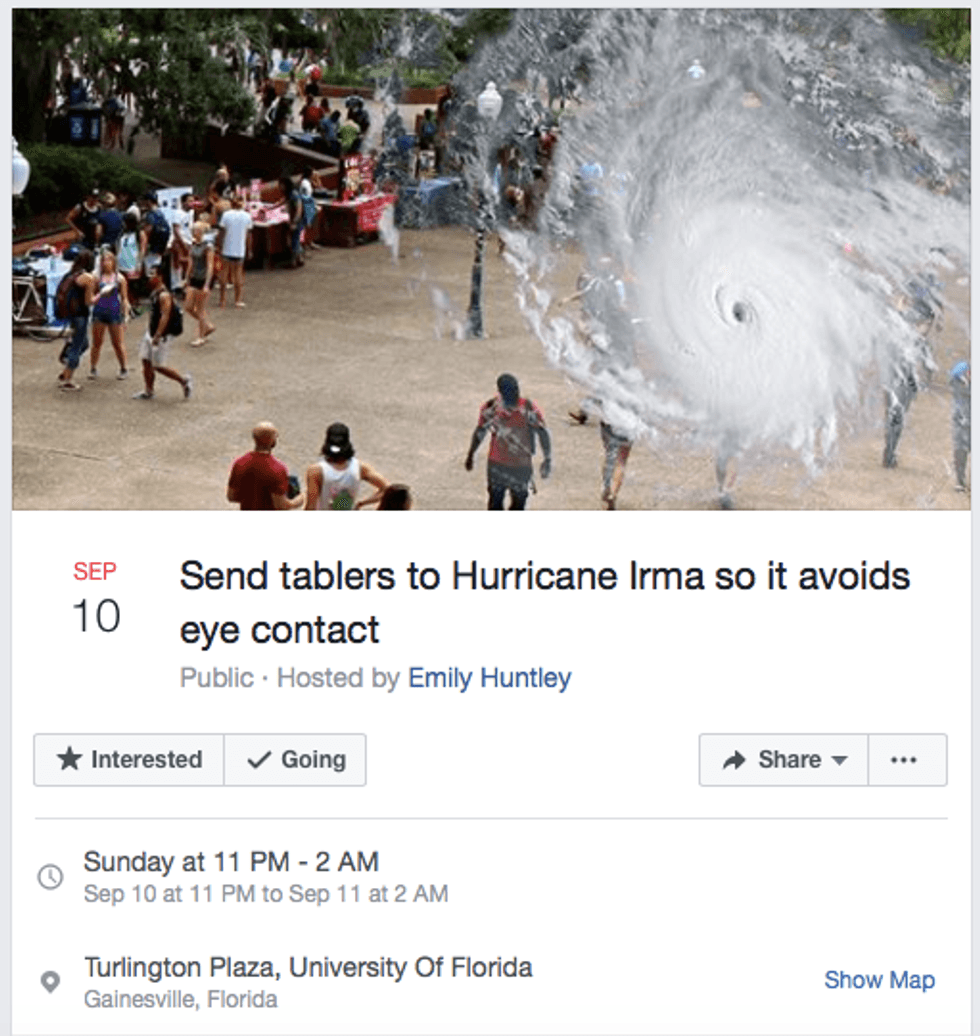 Nothing is more uncomfortable than trying to avoid eye contact with tabling organizations. This will definitely send Irma back into the Atlantic.