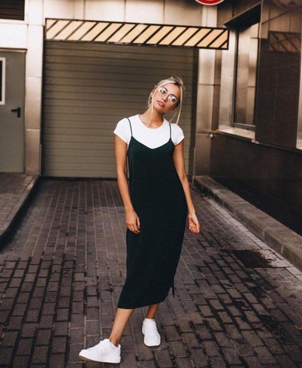 Another take on 'the tennis shoes with a dress' look, try a pairing a longer dress with your sneaks to give the illusion of added height. Add a loose-fitting T-shirt underneath or a cami on top for added dimension.