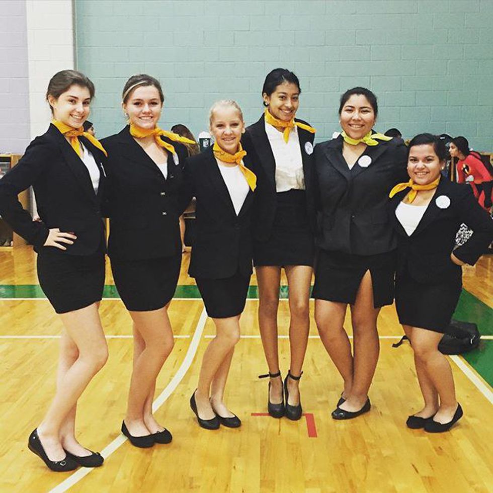 An ideal DIY costume for a group of classy ladies is the Barden Bellas from the 2012 film Pitch Perfect. Extremely simple to put together, this outfit is simply a black pencil skirt, black blazer, white shirt or camisole, yellow handkerchief and a pair of black heels. Most of these things can be found in the average girl's closet, and can be reused for everyday wear.