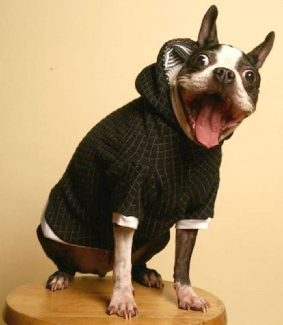 Dogs in clothing can either be a grotesque human gesture or absolutely adorable. In this case, he's pretty freakin' adorable. He's having such a great day because he is both a) a dog and b) a warm dog. This dog is warmer than you which makes his day exponentially better than yours.