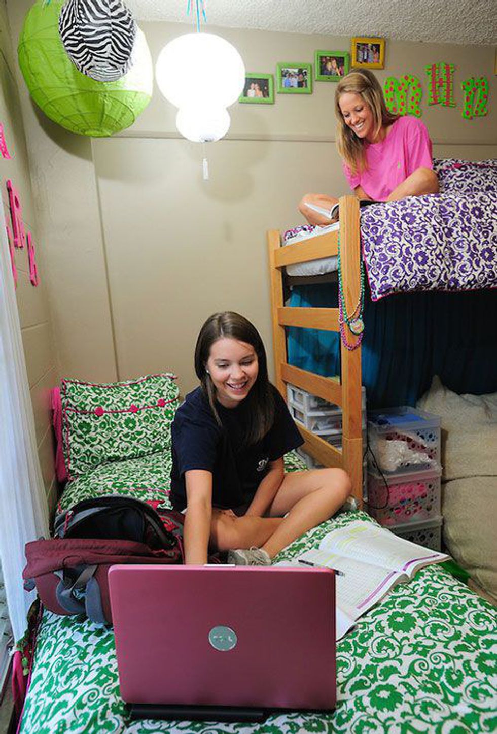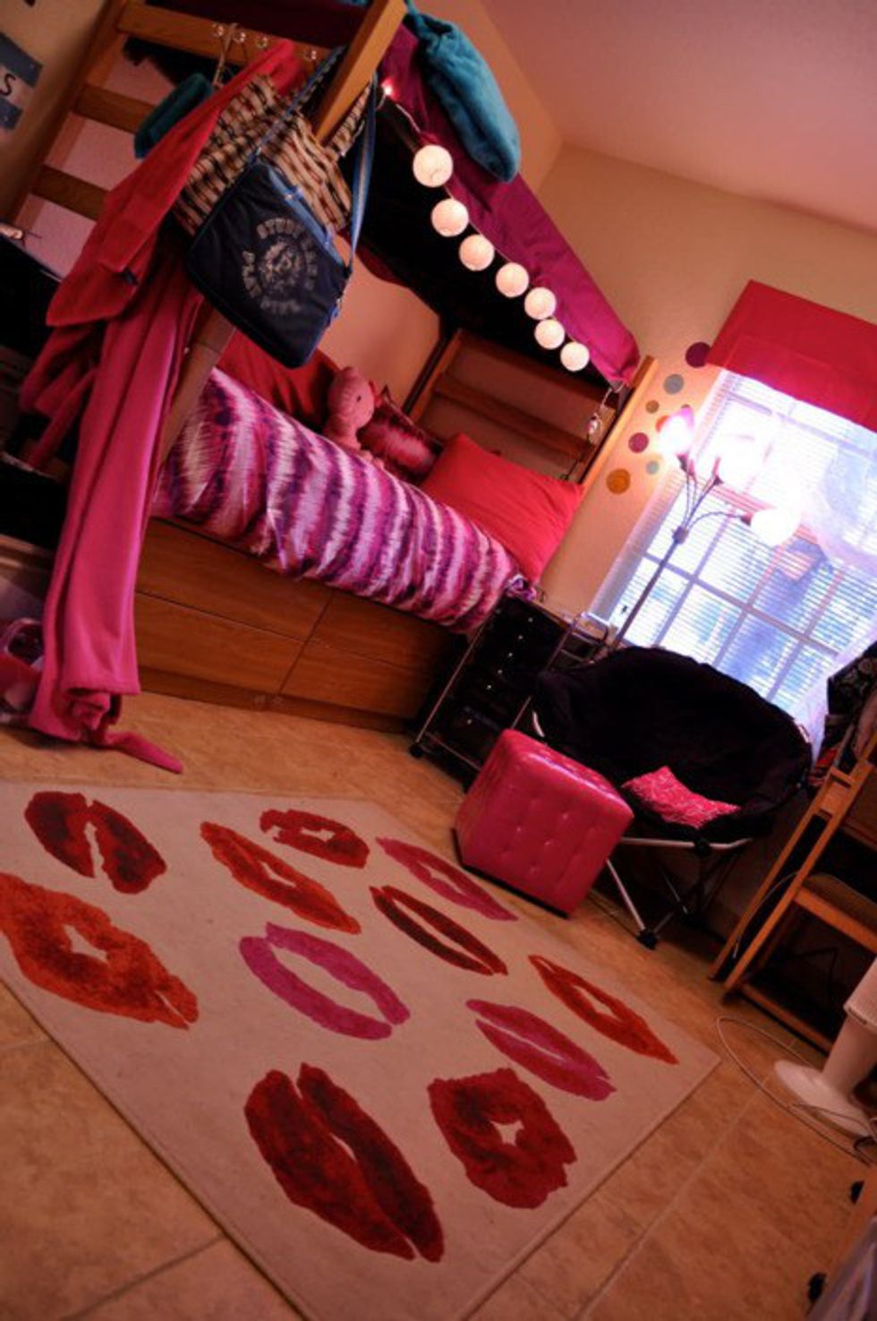 OK, so I'm not a fan of the pink, but my roommate and I were close enough that we put our beds and dressers like the ones pictured above. Not only did it give us a ton of room by putting four pieces of furniture where one was, but it actually stabilized the top bunk and made it way less sketchy.