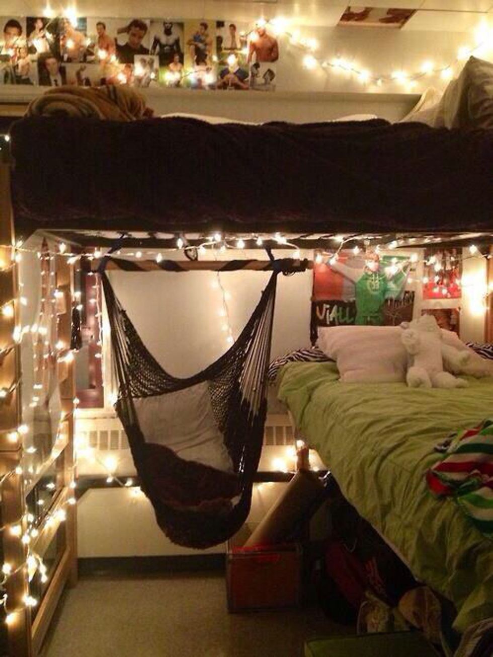 First semester, I lofted my bed and hung this old hammock chair I'd found at a little store downtown. I cannot describe how wonderful it is to come home from classes and just swing under your bed. Not to mention, whenever I had my door open, anyone walking by would come in and ask me where I got my hammock chair. If you ever see one of these, get it! Also, putting up string lights underneath your bed gives this warm, Tumblr-esque glow that will make your dorm room the envy of the floor!