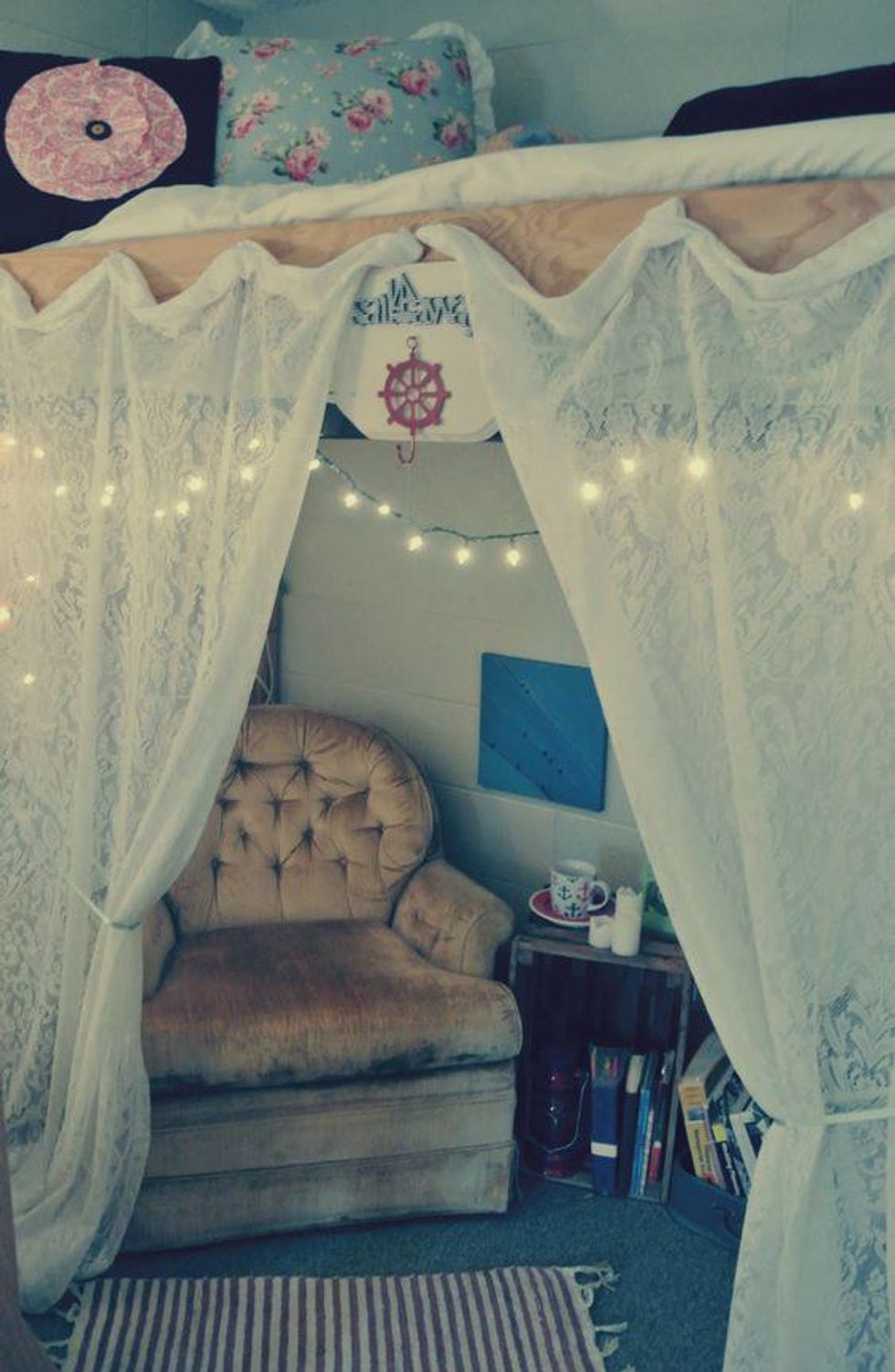 It's always nice to have a little privacy when sharing a room with someone. If you go to the fabric store and get a few yards of cheap lace, you can have your own little hide-away.