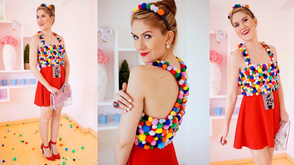 Sassy and cute, this costume has a different feeling depending on whichever skirt shape you choose. Pick a swingy skirt for a flirty feel, a pencil skirt for a sophisticated edge, or a full skirt for a romantic look! Supplies: tank top, skirt, craft pom poms, gray felt for the dispenser.