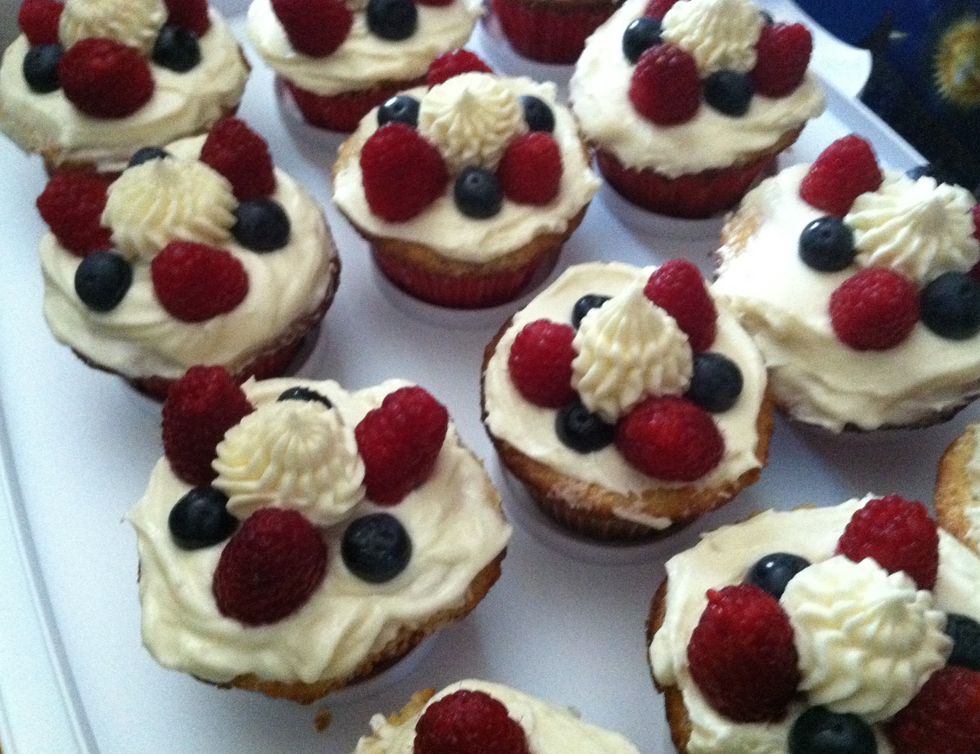 The original recipe was featured on Ina Garten's show "The Barefoot Contessa" on the Food Network. I later adapted the main elements of the cake to make my own summer birthday cupcakes. These consist of vanilla cupcakes, cream cheese frosting, fresh raspberries and blueberries, and a bit of extra frosting piped on the top using a star tip.