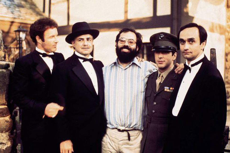 (From left to right, James Caan as Sonny, Marlon Brando as Vito, director Francis Ford Coppola, Al Pacino as Michael, and John Cazale as Fredo)