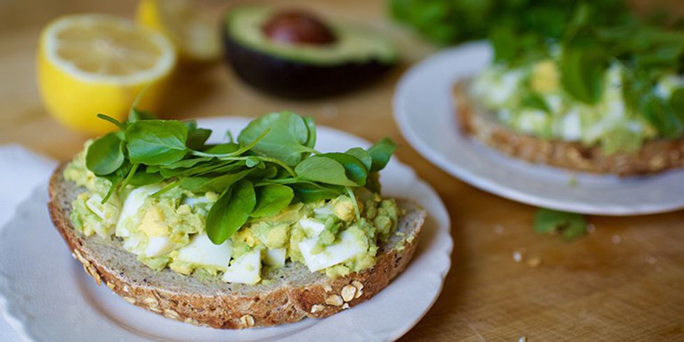 If you're in too much of a rush to cook, forego the egg, mash the avocado in its skin and season with salt and pepper, scoop it onto a slice of whole grain bread, and throw on a handful of greens.
