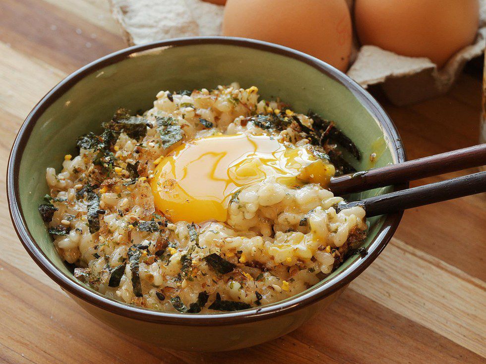 Sounds super fancy, is so simple. Tamago gohan translates to egg rice, and it is precisely that: a raw egg is cracked over a bowl of steaming white rice and topped with sesame seeds or soy sauce. (You can read more about this typical Japanese breakfast here).