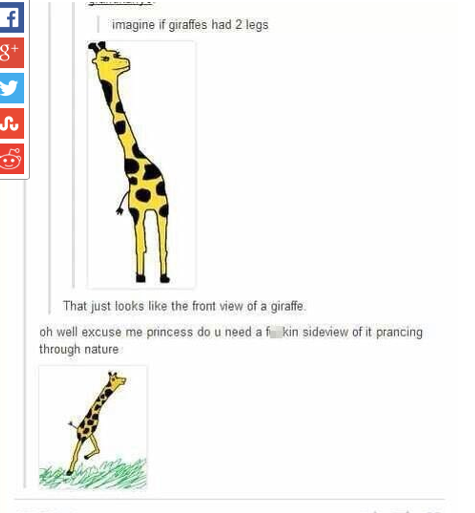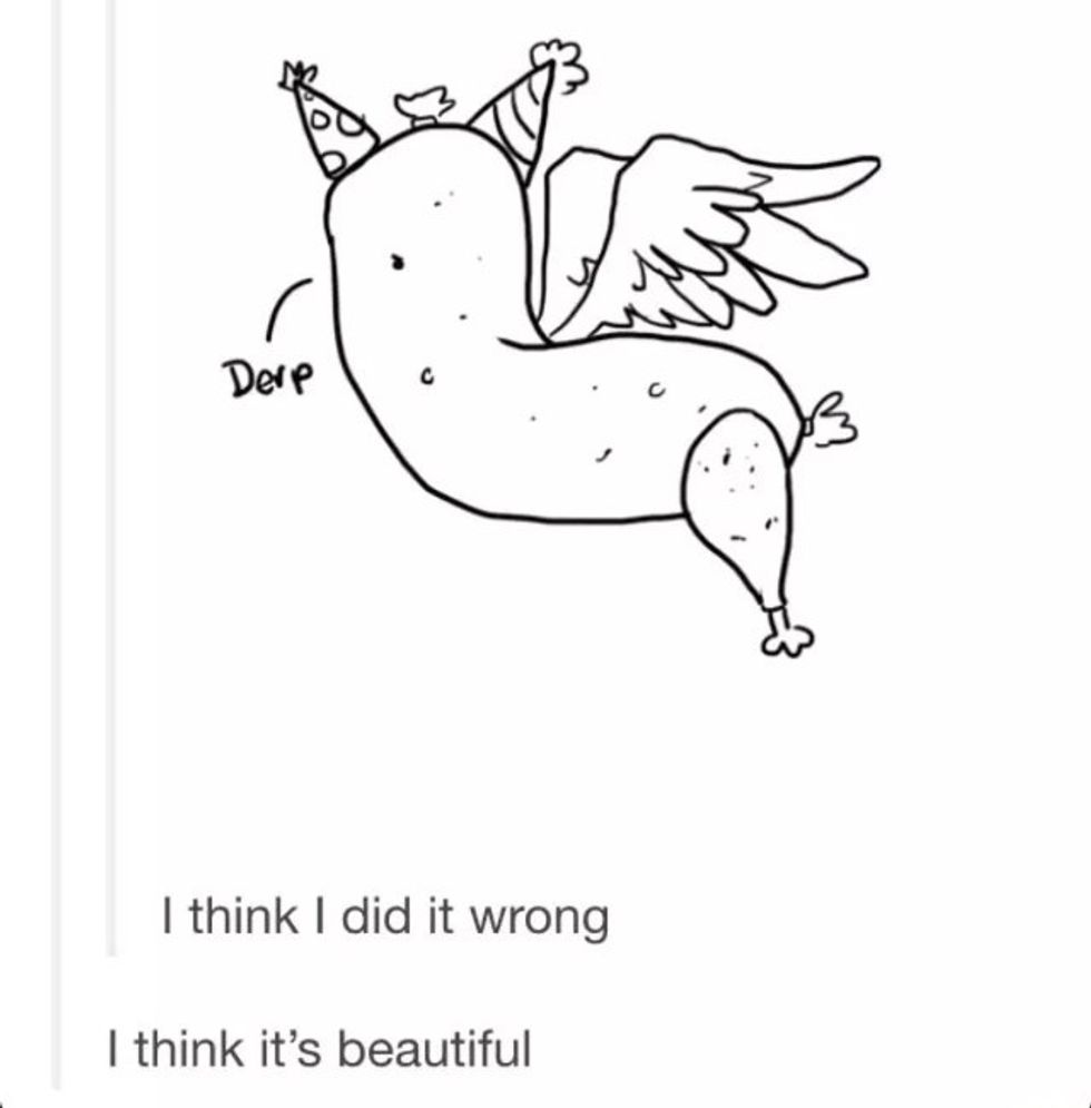 I don't know what it is about this post that is so hysterical to me; maybe it's how the artist took "draw party hats/wings and a drumstick" literally, or the random "Derp" escaping from the finished product's mouth or the comment at the bottom that says, "I think it's beautiful." I imagine the artist drawing the picture going along thinking, "Dang, I'm so good." Then they look at the final picture and say, "Shoot, I think I did it wrong." So they show it to their friend and the friend responds by lightly touching the picture and whispering, "I think it's beautiful," and the image of that just makes me laugh so hard.