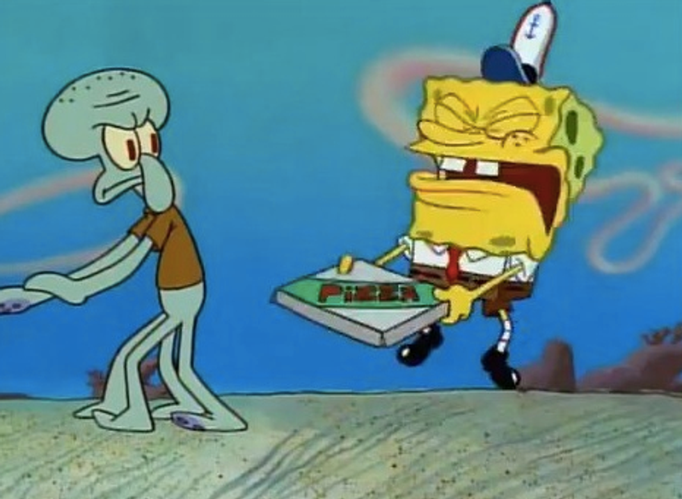 When I first read this post, I just imagined that scene on Spongebob where he's holding the pizza and singing the Krusty Krab pizza song and Squidward is just staring at him like "wtf are you doing", you know: