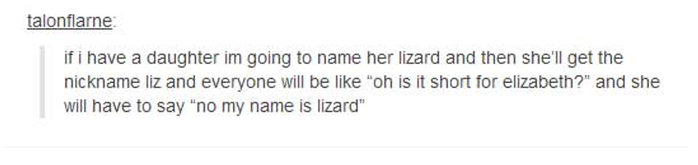 Can you just imagine for a second? This little girl is in 5th grade and she introduces herself to another girl in her class. The girl responds, "Oh Liz, that's a pretty name, is it short for Elizabeth?" and Liz responds, "No. It's short for Lizard, yeah I've asked and apparently my parents don't hate me." I just--God it's just so funny. "Hi my name is FREAKING LIZARD."