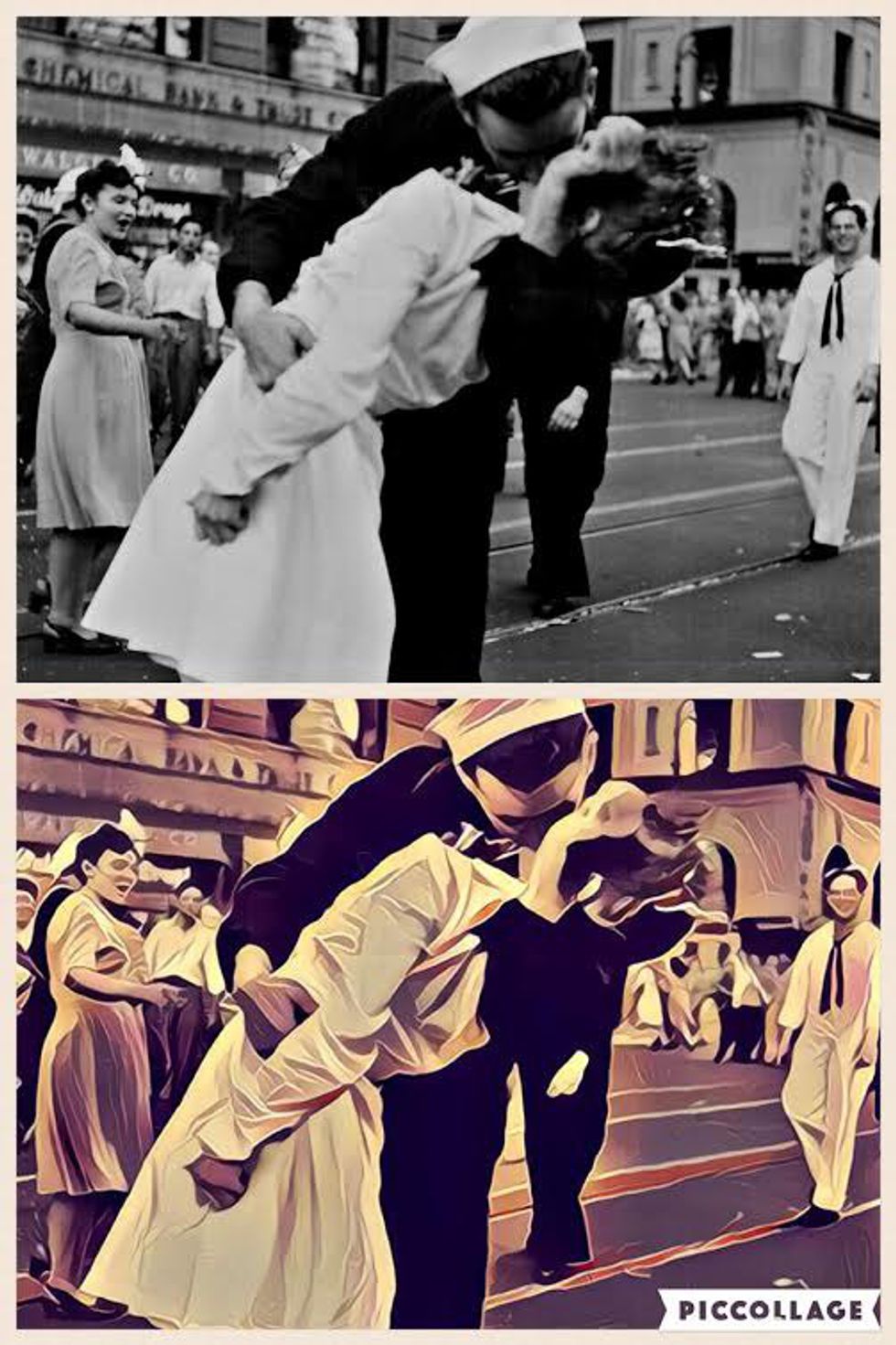 This legendary kiss from World War II of George Mendonsa and Greta Friedman was edited using Prisma's "Mononoke" filter, giving the photo a more romantic style.