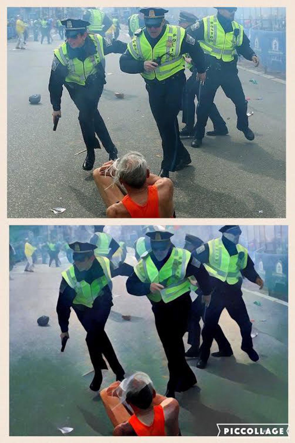 This iconic photo of police reacting to a second explosion at the finish line of the Boston Marathon in 2013 was edited with the "Udnie" filter on Prisma. This Prima filter creates a sense of chaos and confusion that mimics what was occurring in real life when the photo was taken.