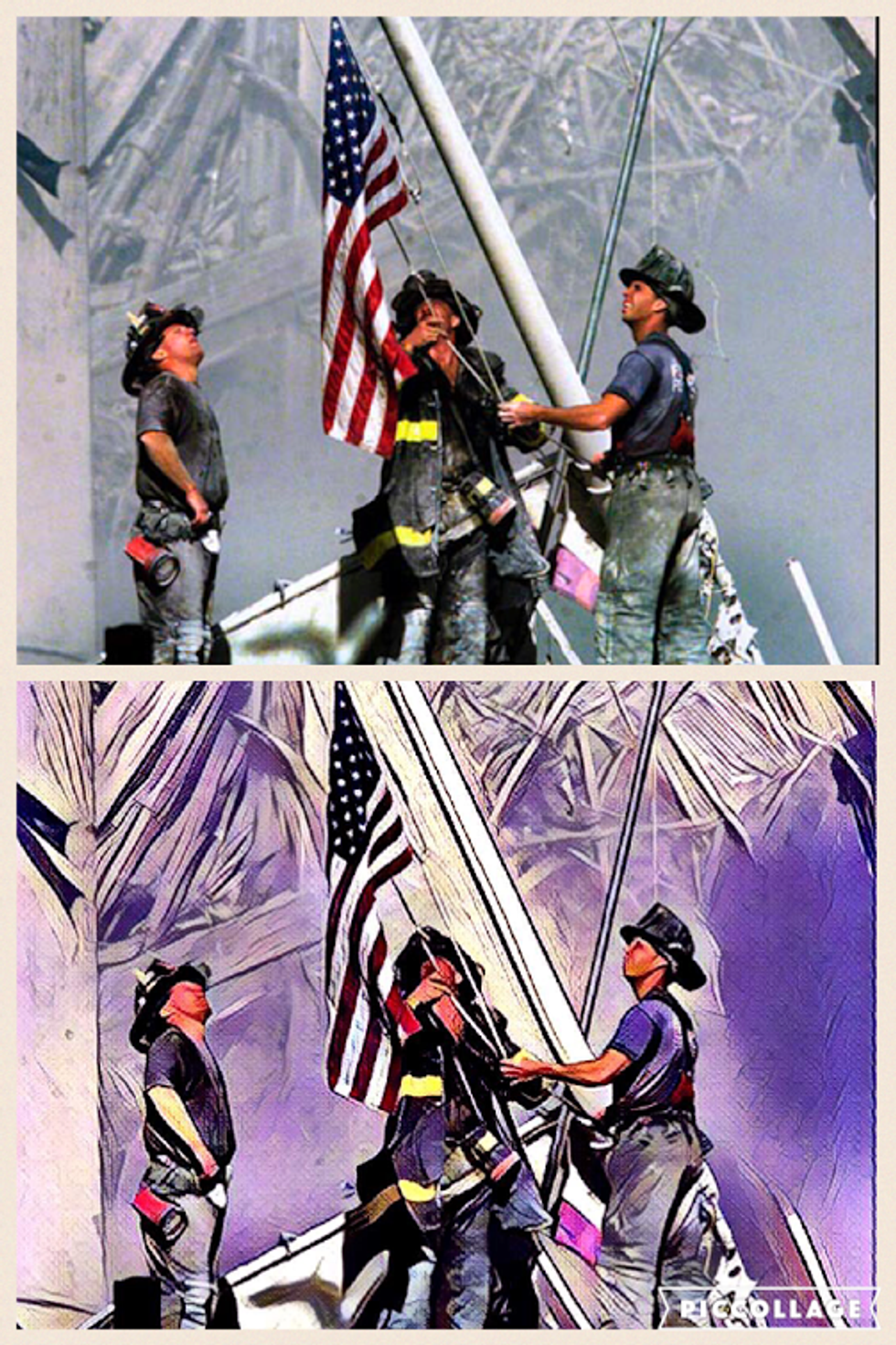 This photo by Thomas E. Franklin was captured on September 11, 2001 at the site of the World Trade Center terrorist attack. These American firefighters were raising an American flag on Ground Zero. The photo was edited with the "Tears" filter on Prisma.
