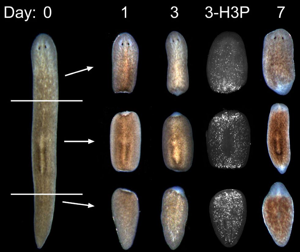 This flatworm can regenerate head, body, and tail. If bisected, they can grow a new half. If both the head and tail are cut off, the remaining piece can regrow both. They are a powerful model in studying biological regeneration, which could become applicable to regeneration of human tissue.